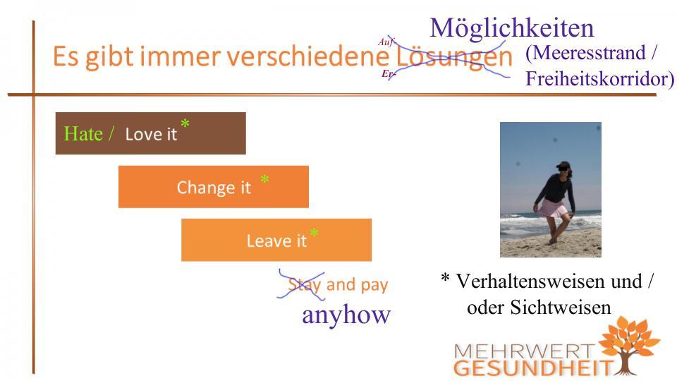 Daher ist (so)dann / nun 'change it' angesagt: Sei es entweder indem Sachverhalte geändert werden (soweit uns Einfluss auf sie möglich oder zu gewinnen ist) und/oder\aber indem wir unsere  Wahrnehmung der Situation verändern: das eigene Bild von den Sachen / Verhältnissen / Vorgängen / Wprte (dafür bis dagegen – und Reaktionsreflexe darazf) ändern. Etwa indem Übel / Leiden nicht als unabwendbares (gar verdientes oder ungerechtes) ‚Schicksal‘, sondern als Herausforderung zum Ändern / Bewältigen / Handhaben, angesehen werden.