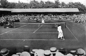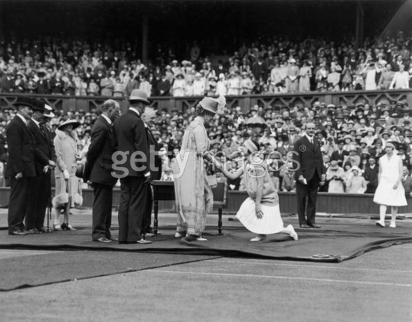 In (den Jahren) 1919 (bis 1923 ununterbrochen wie 1925 wieder als Siegerin des Dameneinzels) knickste  Suzanne Lenglen aus Frankreich bei Erhalt einer Jubiläumsmedalie auf dem berühmten Rasen tief vor/von Königin Mary: