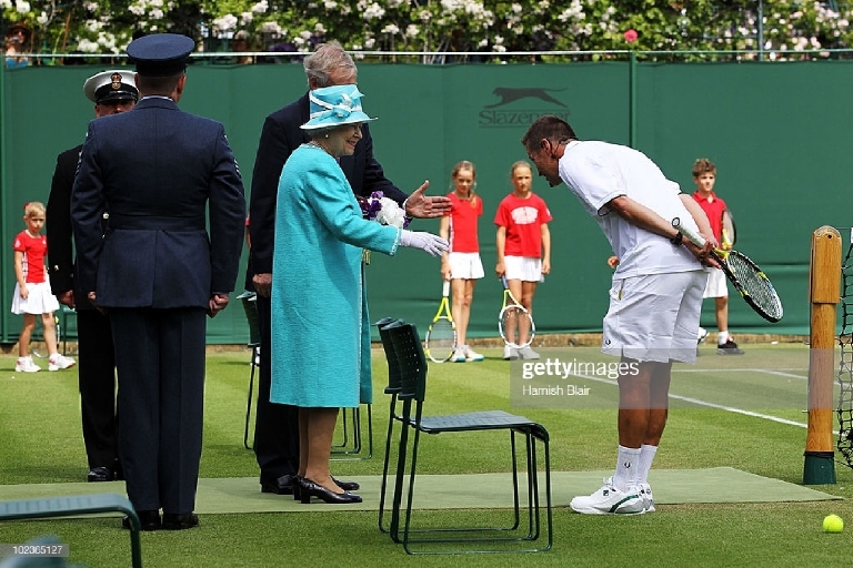 [Frau Serena Williams, beim Besuch der Königin 2010 auf ‚dem zentralen Rasen‘ vorgestellt: Wer so gutes Tennis kann, dass sie hier / an ‚der Weltspitze‘ mitspielt, darf sich ohnehin ‚als am britischen Hofe eingeführt‘ betrachten/benehmen]