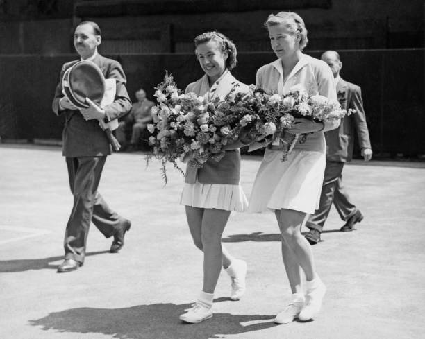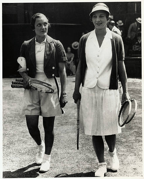 27th June 1938: American tennis player Helen Jacobs (left, winner) shakes hands with Britain's Peggy Scriven after their centre court match in the Women's Singles at Wimbledon. 1938gettyimages-3346950-1024x1024.jpg ????