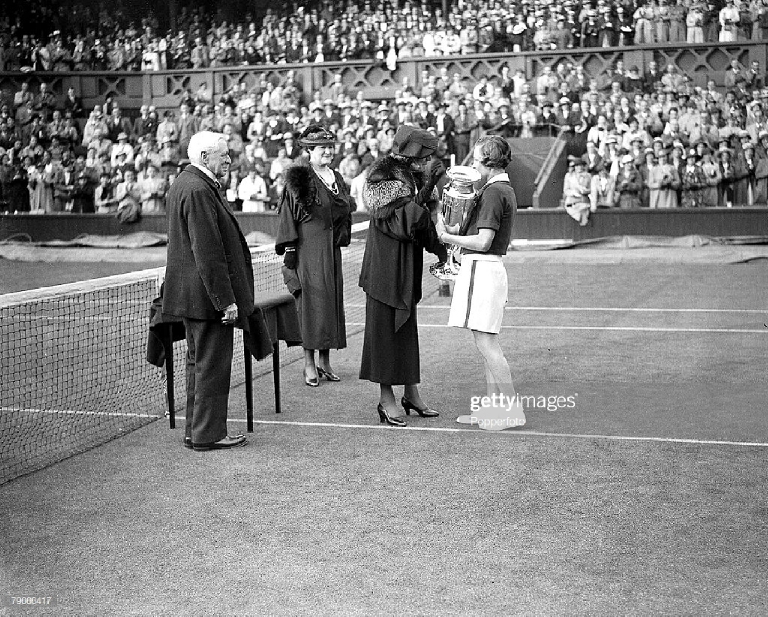 1936 Helen Jacobs USA curtsies to honorific Princess Marie Louis.