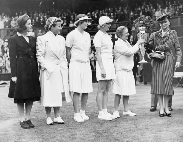 1938 knickst die US-amerikanische Damen-Team-Kapitänin Mrs. Wightman (2nd-r.) für/mit Wightman Cup vor der Herzogin (right).
