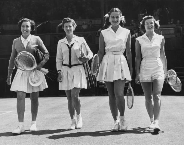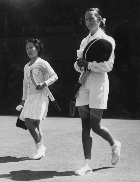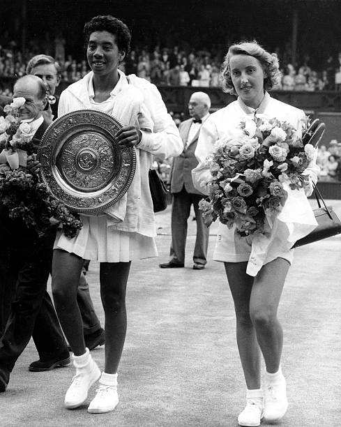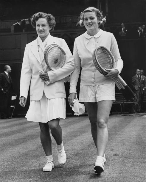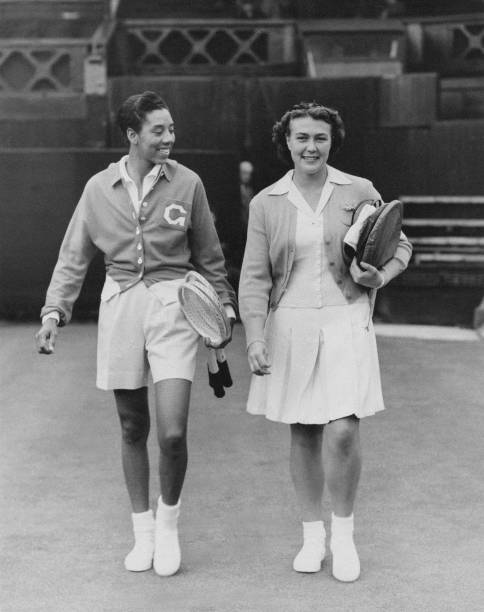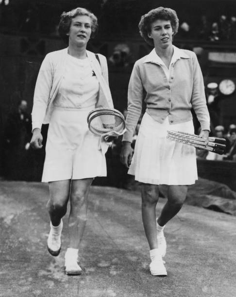 1951 die US-Amerikanerin (links, dann 1956 in Paris erste afroamerikanische Grand Slam Siegerin überhaupt) Althea Gibson beobachtete Patricia Ward GB zur Koordination ihrer gemeinsamen Knickse beim Betreten des Platzes zum Zweitrundenspiel in Wimbledon.