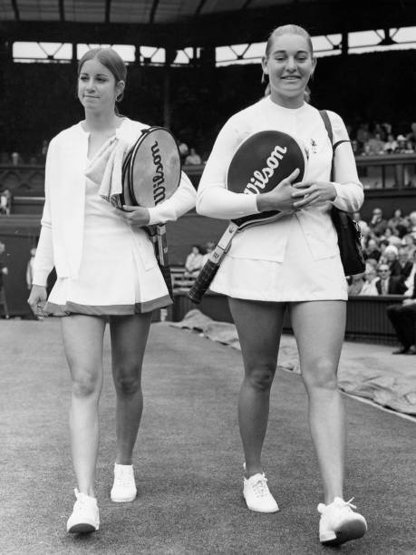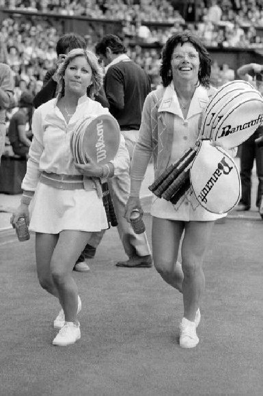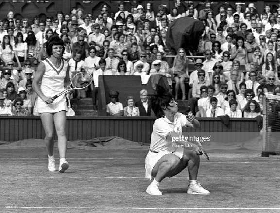 Billie Jean King (left) and her doubles partner in 1971 Rosie Casals USA, too – who is sidestepping for the ball.