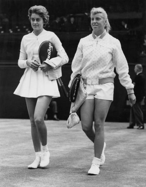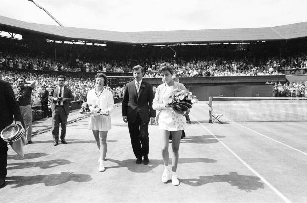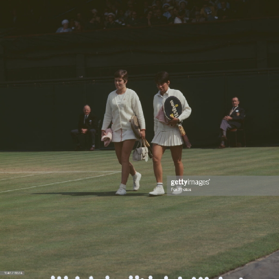 1966 Billie Jean King and Maria Bueno (right ‘runner up’) are escorted by officials to curtsy at their final on Centre Court.