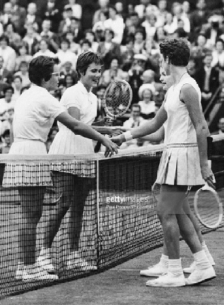 1965 weitgehend synchronisiert knicksen die vier Damendoppelfinalistinnen Billie Jean Moffitt (bzw. Billie Jean King) aus den USA mit Maria Bueno aus Brasilien zusammen/hintereinander eintretend mit ihren französischen Gegnerinnen Francoise Durr und Janine Lieffrig.