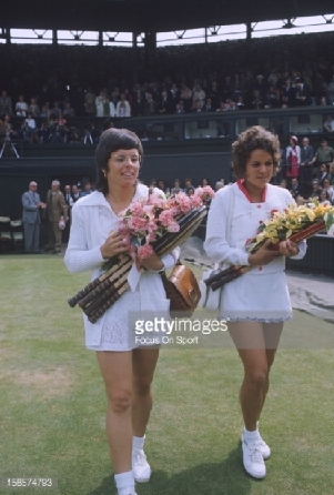 Billy Jean King (links, USA auch in diesem Jahr Damenturniersiegerin) und Evonne Goolagong aus Australien knicksen mit ihren, für Einzelendspielteilnehmerinnen obligatorisch gewordenen, Blumengebinden des Clubs – die nachher für sie meist durch Ballkinder in die Kabinen zurück gebracht werden.