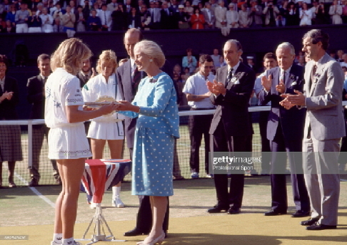 Dann, nach dem Damenendspiel, knickst hier Turniersiegerin Stefani Graf, auf dem Centre Court, vor  dem, sie auszeichnenden, Herzog, und der gratulierenden Herzogin gegenüber. – auch ‚nach‘ oder ‚vor der jeweoöigen Generin‘ wurde. Zeremoniell über die Jahre, wiederholt getauscht, doch abschließend stets nochmal gemeinsam beim Verlassen des zentralsten Platzes begleitet.
