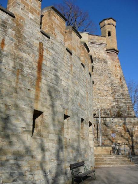 Südöstlich unter der bis an die Bastionen(ebene) gemauerte Vorburg mit/aus Willhelmsturm vav-und-waw Niederem Vorwerk drüben unten an Michaelsbastei.