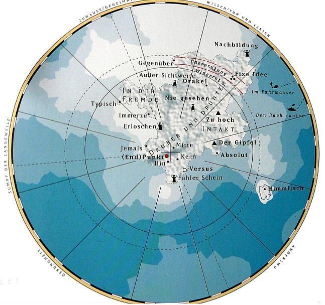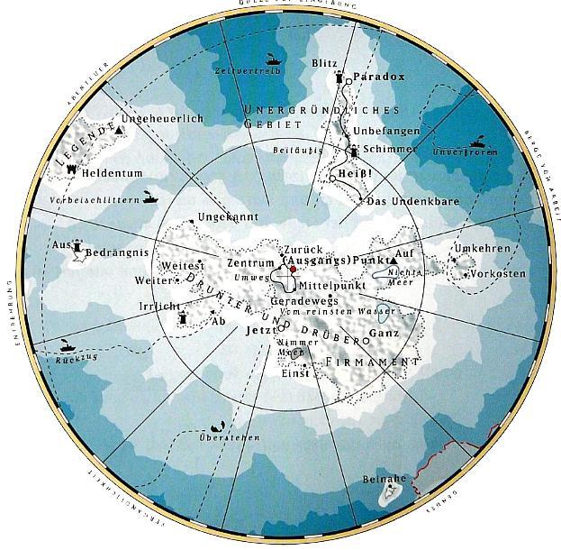 umgeben von einem weiten und stürmischen Ozean, dem eigentlichen Sitz auch des Scheins. Wo manche Nebelbamk und manches bald wegschmelzemde Eis, neue Länder lügt. Und indem es den auf Entdeckungen herum schwärmenden Seefahrer unaufhörlich mit leeren Hoffnungen täuscht. Ihn in Abenteuer verflechtet, von denen er niemals ablassen, und sie doch auch niemals zu Ende bringen kann. [Verlinkende Hervorhebungen; O.G.J.] |