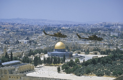 „Sie kannten den Ton. Wie an diesem Nachmittag [...] war der klagende Klang schon seit Monaten Symbol [sic!] der Grenzen, die ihr Dasein umschlossen. Es war das Pfeifen schottischer Dudelsäcke, das nun zum letztenmal durch die alten Gassen hallte und die wenigen britischen Soldaten wegführte, die innerhalb der mauerumgürteten Altstadt Jerusalems zurückgeblieben waren. [...] Die Soldaten hielten den Blick geradeaus gerichtet. Nur der erste und der letzte jeder Kolonne machten eine Ausnahme. Die Maschinenpistole schußbereit unter den Arm geklemmt, musterten sie unablässig die Fassaden der Häuser. |