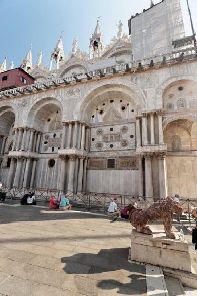 Die sehr alte, westlichste Reliefplatte der Etoimasia/Hetoimasia  (aus dem 7. oder 8. Jahrhundert) soll – (prompt über/durch Maria/Venezia mit Kind  [Abb.] drinnen überm Querschiffeingangsportal zwischen – na klar – Markus und eben Johannes) korespondierend mit der Apsis   ‚im Allerheiligsten‘/Presbyterium der ‚goldenen'Innenraume den ‚Allherrscher/Weltenherrscher‘ (griechisch: ‚Pantokrator‘ erblich/testamentarisch, äh namentlich, sei/werde es ‚Christus‘, gar Jesus/Jeschua, wenn drinnen auch alleine/singulär) auf ‚seinem‘ (na klar göttlichen, ihm eben zugerüsteten) Thron darstellend, zu dessen beiden Seiten sich hier außen je sechs Apostel in/als Schafe/n symbolisiert bis verstanden (um's Heilige Lamm drinnen) – gruppieren. – Spannungsfelder des ‚eigentlichenThemas der ganzen Gebäude hier im/als Zentrum (jedenfalls/immerhin) Venedigs durchaus verdeutlichend verborgen? Partienen des Schachspiels erscheien gegenüber dem was insbesondere zwiwschen Christen und Juden erfolgt (vieleicht) vergleichsweise ... [Schafe- und/aber Herrschende-Topoi]