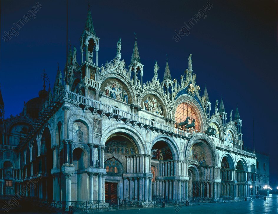 Bereits ab dem 12. Jahrhundert wurden die Mosaiken angebracht (teilweise - insbesondere um 1500 und um 1750 - ersetzt), und im 13. die fünf Außenkuppeln durch Fensterreihen erhöht, sowie die doppelten Säulenreihe, an der Fassade des – bereits ebenfalls im 13. Jahrhundert  hinzugefügten –  dreiseitigen Atriums aus byzantinischen und anderen Beutestücken, erreichtet, und die Pala d'oro am Hochaltar erweitert.