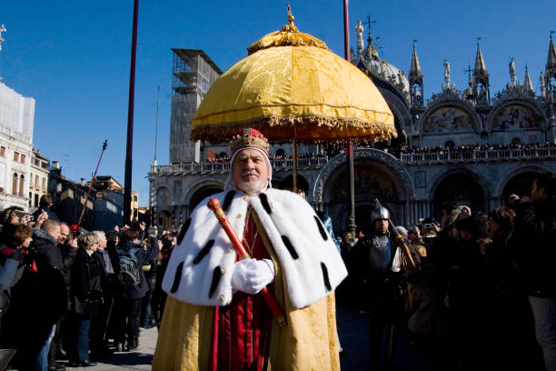 Insbesondere während vieler Prozessionen, zumal über die Plätze vor den zentralen Gebäuden und auf dem Wasser, zeigten sich die – hier stets recht zahlreichen – Hoheiten und Amtsträger, respektive ihre prächtigen Würden, dann auch immer wieder allen (Raum und Zeit dafür findenden) Einwohnerinnen und Bewohnern sowie bereits früh oft eher zahlreichen, zumal wichtigen – Gästen ‚der Stadt‘, und ließen sich huldigen. [Abbs. Historische Prozessionszeichung vor. 13. Jh. und zu,indestcarnevalensische‘ Getty-images vor Kuppelbau und in Gondel auf Canalzzo auch des heutigen Patriarchen]