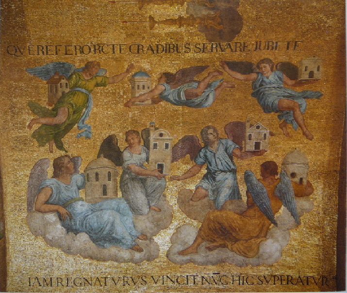Immerhin von eiem ‚Brunnenschacht‘ nach oben geöffnet/verglast konstruierter Pardiesbogen überwölbt, zeigt Mosaiken jenes kaum weniger heftig verwendete und popular umgedeutete bis missbrauchte, Vorstellungskonzept der (zumal verzaubernden / betörenden / überwältzigenden) Paradiesessehnsüchte, dessen – zumal vorgebliche – Verortungen immerhin zu Serenisima's Zeiten ‚sinnigerweise‘ sowohl außerhalb in/als der Stadt vor dieser Kirche bzw.dem Palzzo Comunale, als auch [jeweils] darin gemeint/gesehen werden mochten.