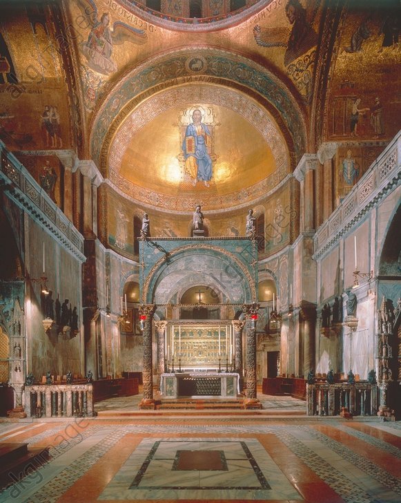 Zentrale Apsis, die östliche Halbkuppel des einstigen dogenkirchenschiffs der Serenissima, mit musivischem oh Schreck Bildnis, zwar wohl (zumal da menschenartig dargestellt) des  Im(m)anuel, griechisch: Emanuel – „G-tt mit/bei/‚unter‘ uns“ der drüben im Zentrum der vollständigen Chorkuppel dargestellt, doch hier als/zum einzigen/allerhöchsten/finalen, (drüben über’m Westende des Naos/Langschiffes; vgl. Desis, bis draußen an der Nordseite) richtenden  Pantokrator  auf/in ‚ewigkeitsmahlerischem/n‘ Goldgrund verallmächtigt:  Typischerweise (sozio-logisch, bis kultiralistisch durchaus nützlich erscheinend/ambivalent) erhebt so ziemlich jedes Gemein- bis Individualwesen also, für so manche Leute durchaus überraschender-, bis unvorstellbarer, weise, auch die jeweils andere/gegnerische – Denomination, Ethnie, Familie, Figuration/Gruppierung, ‚Kultur‘, Kunst, Sippe, Sprache, Tradition, Zurück- [eben ‚re-ligo] respektive überhaupt [vom Lateinischen: ‚legio/n‘] zu-Findendes/Vollendendes etc., also Persönlichkeit, diesen, gar unvermeidlichen, ReSCH-Anspruch, [namentlich wie auch immer bezeichnet, bis beschworen] Absolutheit/en näher zu sein, als sonst jemand/etwas) für/von/an/bei sich. – ‚Christus(!) auf dem(!) Thron mit(!) Heiligen‘ vermelden Reise- bis Kunstführer, unverdrossen (von Maacht- und Erbschaftsfragen) in bzw. unter/an der (einst) östlichsten Halbkuppel dieser größten der ‚Dogenkapellen‘ Venedigs (seit dem 15. Jahrhundert  von der Sakristei, näher zum Rivo de Palazzo hin, überholt).