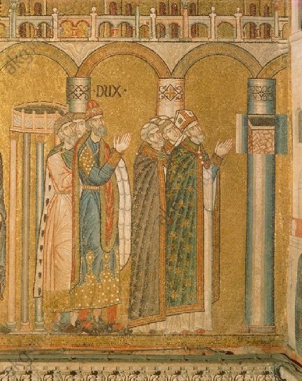 [Mosaik in der Markuskirche mit Doge und Primocerio]  In das  seinerseits mit bischöflichem Rang versehene ‚geistliche‘ Amt des »Primicerio«, aber wurden – eben auf so veneazanischen Mischungsarten und Verbingungsweisen (Morus veneto), wie das ganze Gebäude und seine Ausstattungen überhaupt – auch etwas ‚lateinisierte‘ griechisch-orthodoxe Erzpriester von und zu San Marco (weder durch Byzanz, noch etwa vom Vatikan – sondern) vom jeweiligen Dogen, im Auftrag der Serenisima, berufen. Abbs.  [Westfasade zweites Rorbogenmosaik von links: Griechisch-orthodoxer Primocerio bei Ankunft der Markusrelique in Venedig]